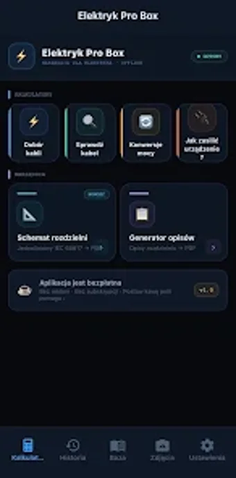 Elektryk Pro Box - это надежное утилитарное приложение, разработанное специально для электриков, установщиков и проектировщиков. Оно включает в себя такие функции, как OCR-сканирование для табличек, калькулятор выбора кабелей для меди и алюминия, а также возможность проверки существующих кабелей. Пользователи также могут выполнять преобразования мощности и получить доступ к шести основным электрическим калькуляторам. Дополнительные функции включают генератор описаний распределительных щитов с возможностью экспорта в PDF, систему папок для изображений табличек и полную историю всех расчетов, выполненных в приложении.